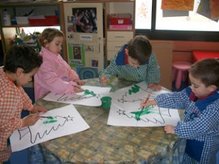 ACÍ ESTEM AL RACÒ DE PINTURA FEN UN ARBRE DE NADAL, EL VAM PINTAR I LI VAM FICAR PAPERETS DORATS PER ORNAR-LO.